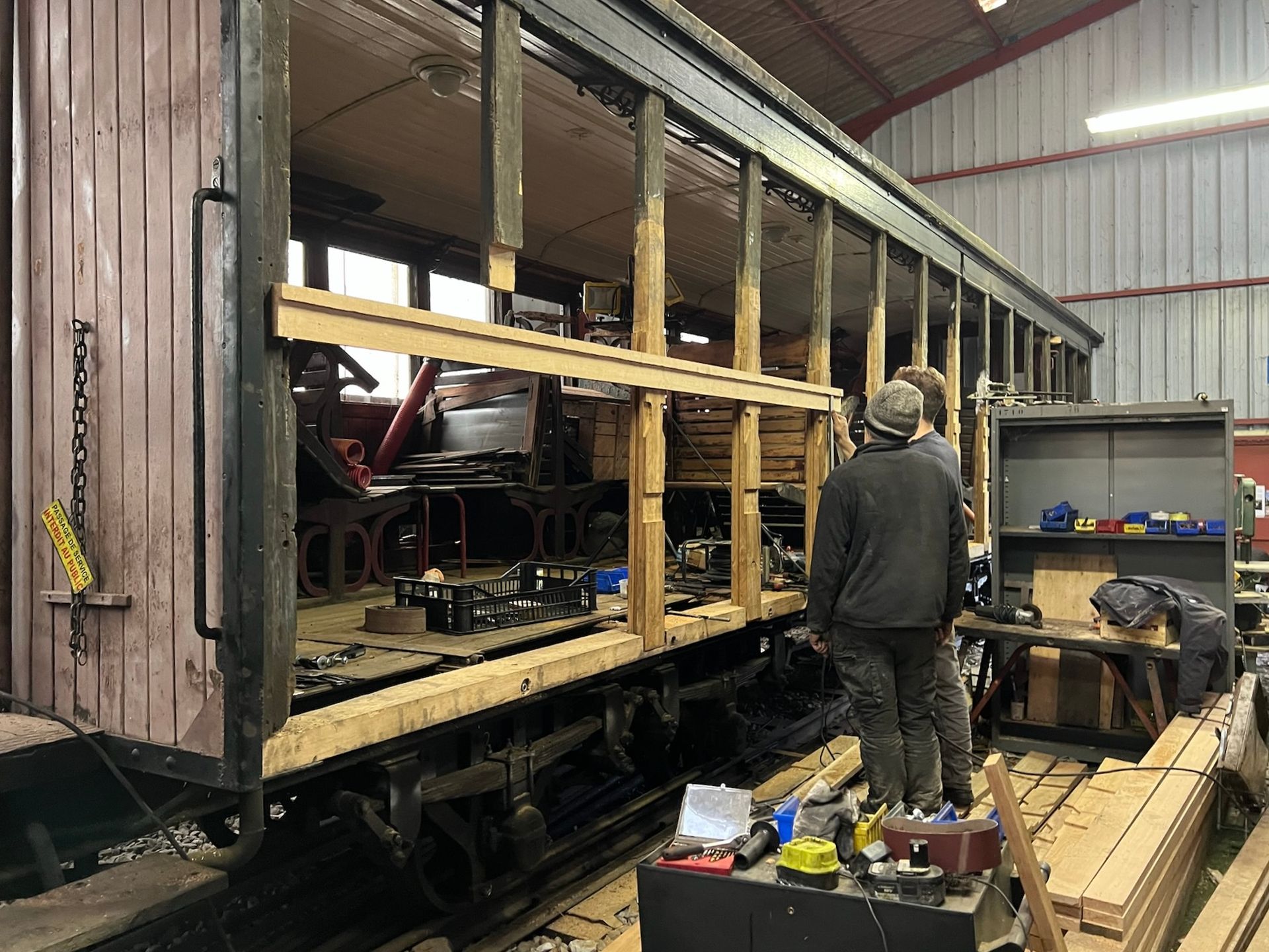 Cette voiture à voyageurs de 1892 est contemporaine de l’ouverture de la ligne Nice – Puget-Théniers et de la célèbre Gare du Sud niçoise. Après un passage en Ardèche sur le Chemin de fer du Vivarais, elle a retrouvé ses rails d’origine où sa restauration a été lancée à l’automne 2025. Toutes les parties dégradées de la charpente en chêne sont remplacées avant de reconstituer l’habillage extérieur en voliges, les vitrages et les aménagements intérieurs avec leurs authentiques banquettes en bois.